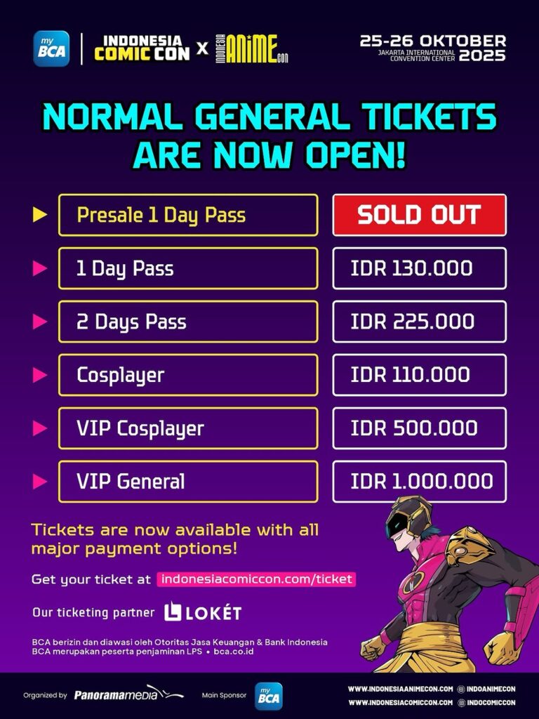 Tiket myBCA Indonesia Comic Con x Indonesia Anime Con 2025 tersedia dalam beberapa kategori: