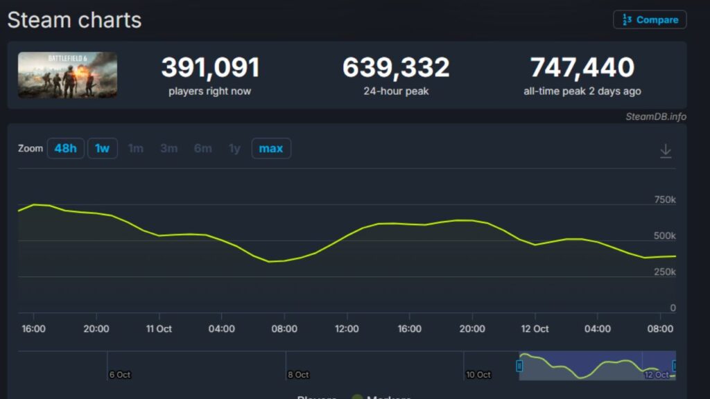 Ledakan jumlah pemain juga terlihat jelas dari data SteamDB. Dalam beberapa jam setelah peluncuran, jumlah pemain aktif secara bersamaan (concurrent players) mencapai puncak 747.440 orang. Angka ini bahkan melampaui jumlah pemain saat masa beta, menandakan antusiasme besar terhadap seri terbaru ini.